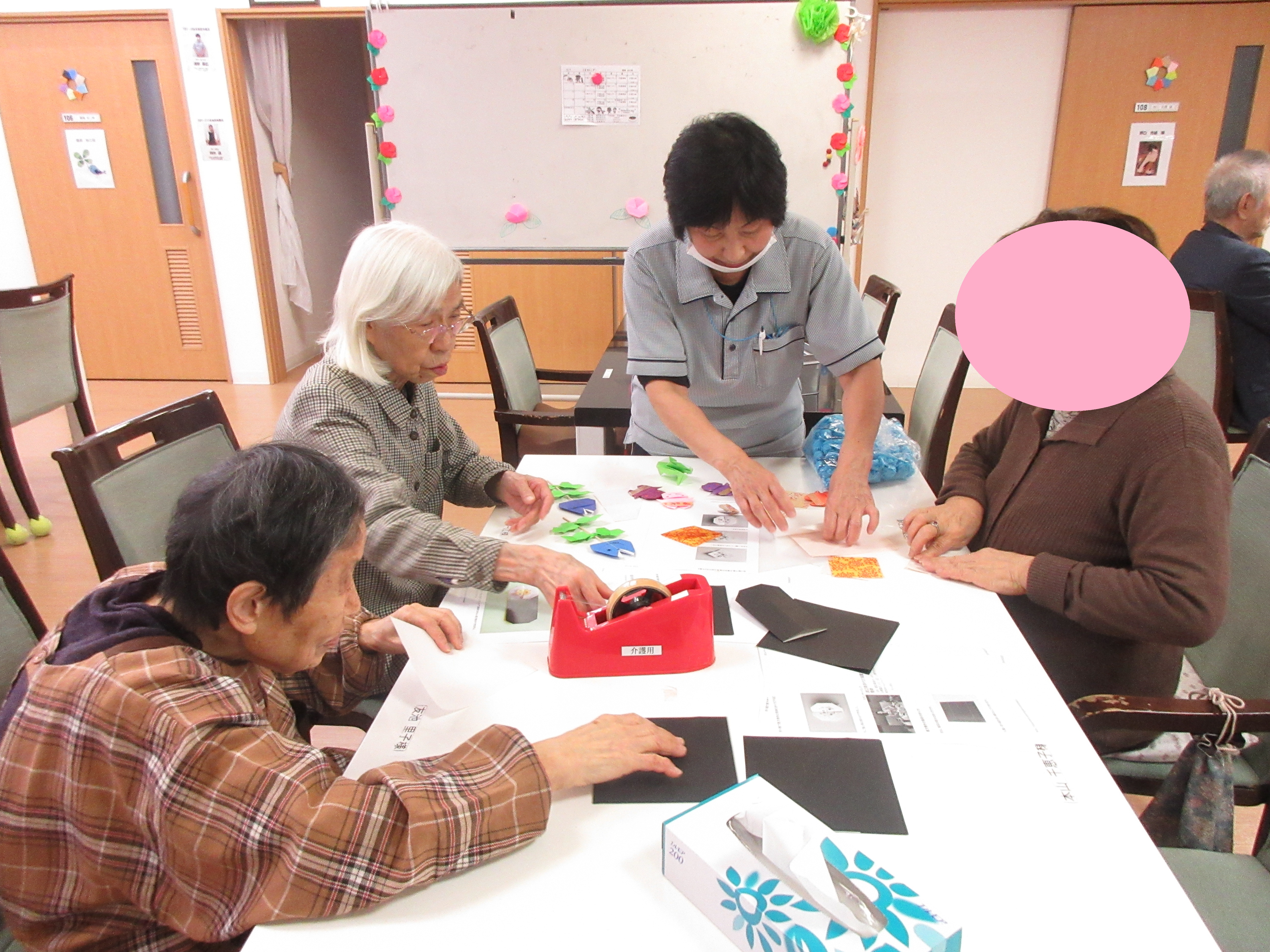 皆さん、こんにちは。今月は敬老会が15日にある為、昼食後のレクレーションの時間でその準備をしていただいています。